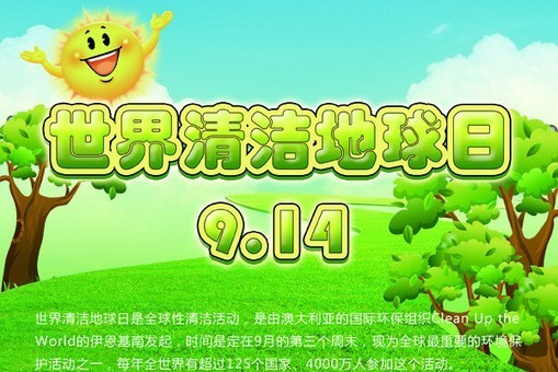 每年的9月14日是“世界清潔地球日”。地球是我們共同生活的家園。隨著工業化的發展,工業廢料和生活垃圾的日漸增多,地球有限的自凈能力己難以承受日漸沉重的壓力。例如我們常用的泡沫快餐飯盒,由于它不能自行分解,對于地球來說,就是一種永遠無法消除的“白色污染”。又如,我們日常用的汽油、柴油等燃料,也是污染地球環境的元兇之一。地球是我們共同生活的家園。隨著工業化的發展,工業廢料和生活垃圾的日漸增多,地球有限的自凈能力己難以承受日漸沉重的壓力。為了保持地球家園的清新宜人,大家要從我做起,不亂扔雜物,減少能源污染,維護地球的清潔。這就是確定世界清潔地球日的意義。