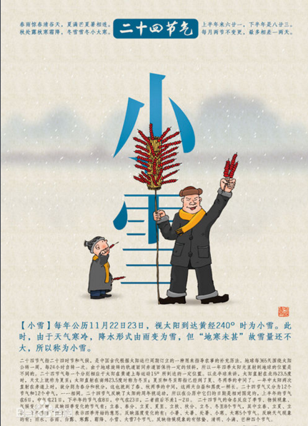 進入該節氣,中國廣大地區西北風開始成為常客,氣溫下降,逐漸降到0℃以下,但大地尚未過于寒冷,雖開始降雪,但雪量不大,故稱小雪。