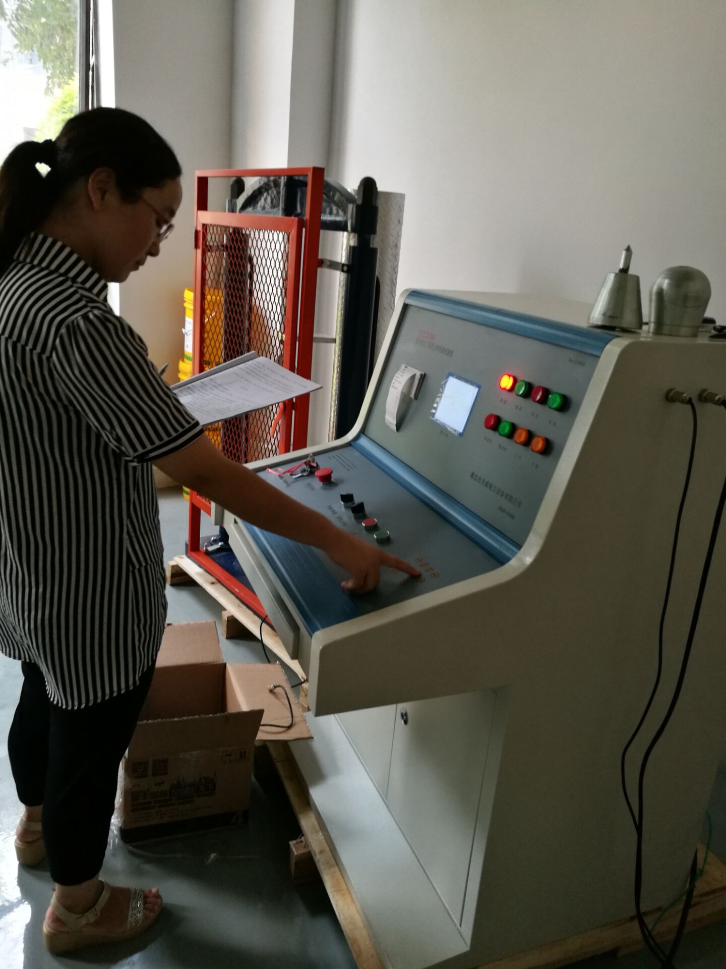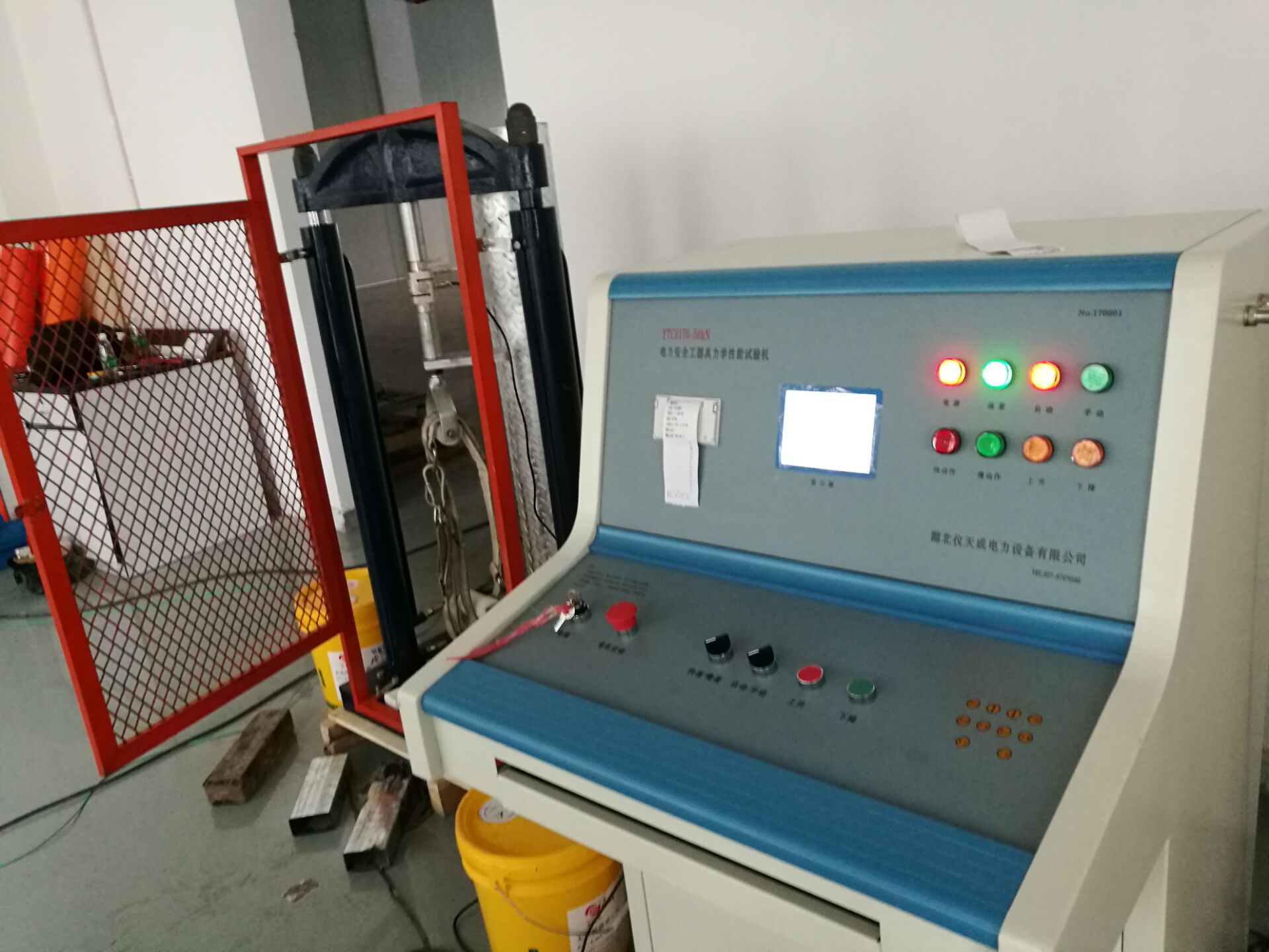 此次培訓的重點設備是YTC6170電力安全工具器具力學性能測試機,我公司研制的電子測力機(電力安全工器具力學性能試驗機),符合國家電力公司《電力安全工器具預防性試驗規程》要求,按《規程》完成各種預防性力學性能試驗。本機由測試顯示和加力設備兩部分組成(如需測安全帽配安全帽試驗臺) 測試顯示部分由拉壓力傳感器、控制鍵盤、液晶顯示屏、微型打印機、手動按扭等組成。鍵盤使用薄膜輕觸鍵,使用手感好,液晶顯示為中文菜單式,操作人員可根據被試對象選擇相應名稱菜單,當需要對測試結果打印時,可打印測試報告,便于備案檢查。本機設置兩個傳感器接口,傳感器3KN、100KN傳感器為測試安全工具之用。安全帽測試為測試安全帽專用。兩只傳感器既可單獨使用,也可同時使用。能滿足不同使用場所環境的要求和工作要求,性能穩定,測試結果準確。