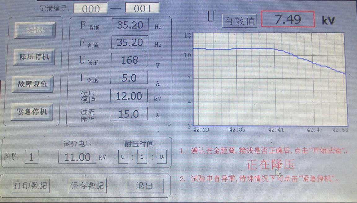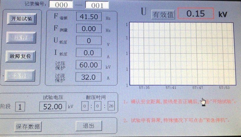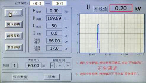 點擊“開始試驗”,系統(tǒng)自動尋找諧振點,右下角提示“正在調(diào)諧,如有異常情況,請點擊“降壓停機””;藍(lán)代表電壓曲線,顯示界面如圖所示