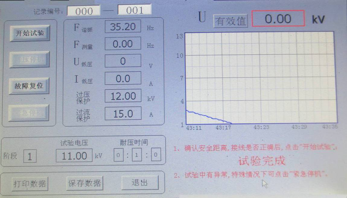 當(dāng)U諧振電壓降壓0時,右下角提示“試驗完成”, 顯示界面如圖所示。