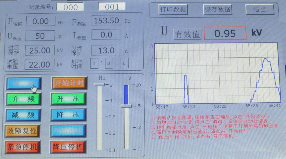 點擊“開始試驗”,如想自動找諧振點,點擊“調諧”,系統自動尋找諧振點,藍線代表電壓曲線,顯示界面如圖所示。
