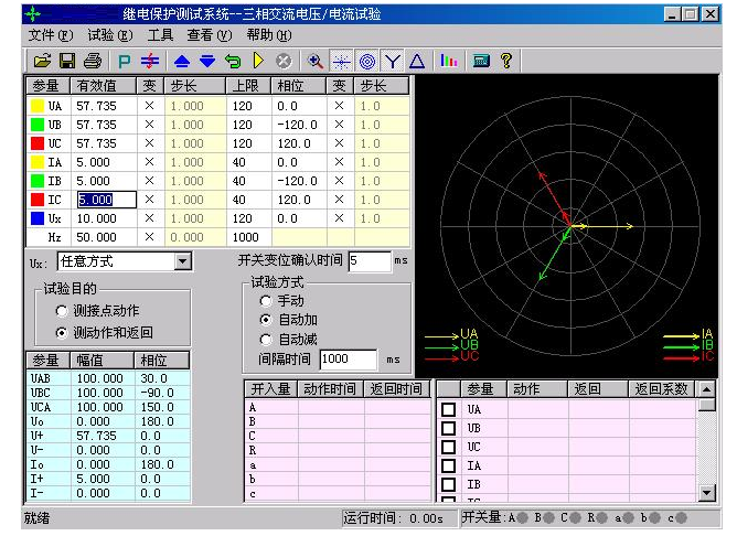 YTC1000微機(jī)繼電保護(hù)測(cè)試儀單欄中常用的菜單項(xiàng),在各個(gè)測(cè)試模塊中其名稱(chēng)或符號(hào)相同,定義的意義和功能也基本相同。這里以“交流試驗(yàn)”模塊為例進(jìn)行介紹,可以適用于后面介紹的各個(gè)功能模塊。界面如下圖所示: