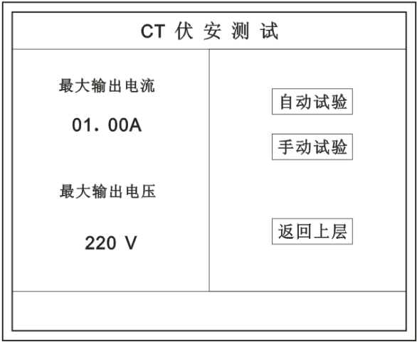 在主菜單界面,旋轉(zhuǎn)鼠標(biāo)將光標(biāo)移動(dòng)到 CT測試 選項(xiàng)上,按下旋轉(zhuǎn)鼠標(biāo)選擇 CT伏安 即可進(jìn)入伏安特性試驗(yàn)設(shè)置界面(如右圖)。光標(biāo)移動(dòng)至 返回上層 ,按下鼠標(biāo)即可返回主菜單。