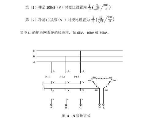 這種接線方式分“N 接地”、“B 相接地”兩種,分別如圖 4 和圖 5 所示。對于這兩種方式,均從 N-L 兩端注入測試信號。根據(jù)所用 PT 的不同,組成開口三角的二次繞組。