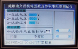 四、在圖5界面中,可以分別對試驗參數進行設置,圖中是設備的默認參數,如需改動,只要點擊需要改動的參數,就會自動彈出一個小鍵盤,如下圖,在小鍵盤中直接輸入需要的參數并點擊小鍵盤上的確認鍵即可,選擇打印的時候只要點擊光標處就可以在是和否之間切換。設定好后點擊確定即可回到主界面,空杯檢測完畢沒有問題后,將油杯的內電極取出置于油杯架上,取40ml待測油樣置于油杯中(注意:注入油樣時一定注意不能出現氣泡,應沿著杯壁緩緩注入),油樣注入后,再將油杯的內電極慢慢的放到位。(動作要慢一些,防止動作太快,排氣不及時,使油樣溢出),接好測量信號線和溫度信號線,點擊圖3中的自動測試,一般測油是都按照規程90℃測量,同樣也可以選擇立即測試,在當前溫度下測量。