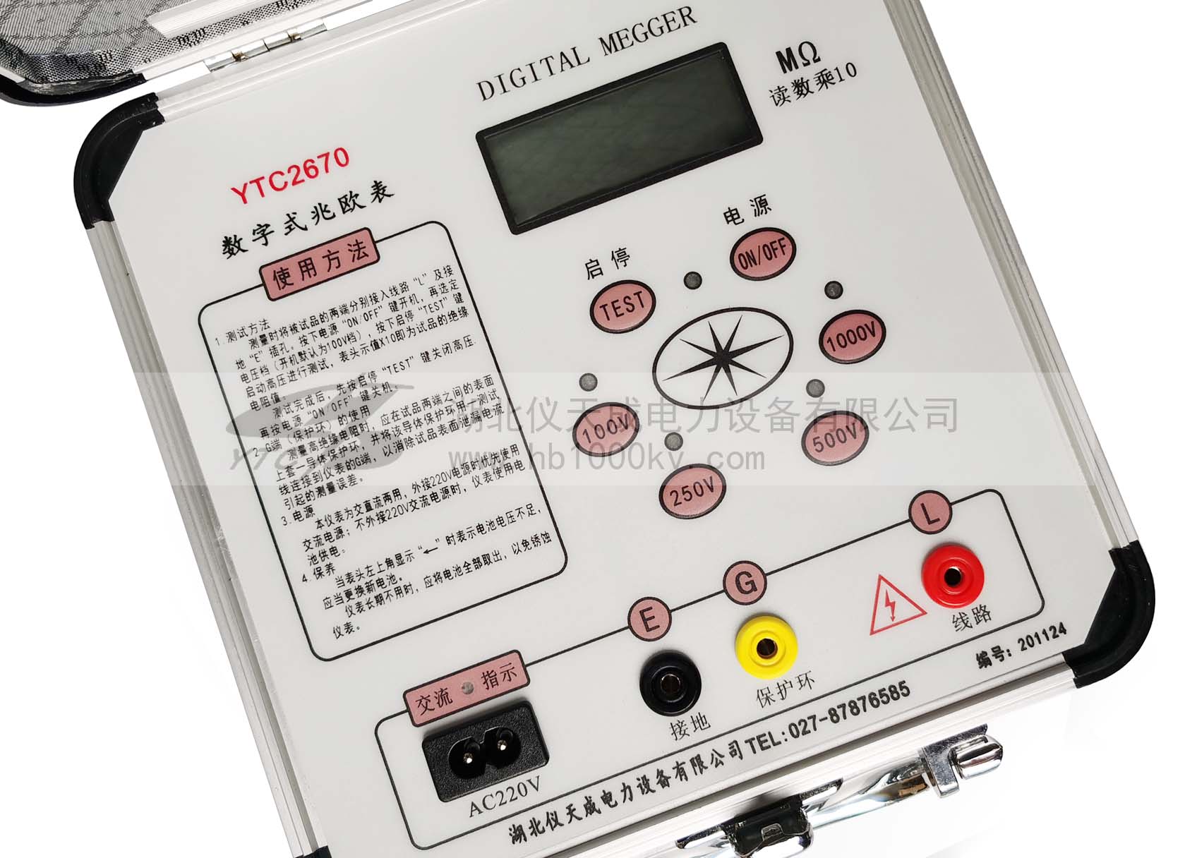 5、YTC2670數字式兆歐表適用于測量各種絕緣材料的電阻值及變壓器、電機、電纜及電器設備等的絕緣電阻。
